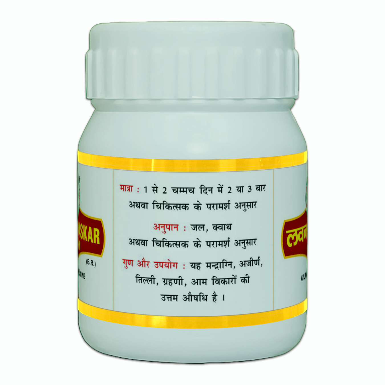 * Indication: Lavanbhaskar Churan is an excellent medicine for loss of appetite, indigestion, spleen enlargement, sprue (Grahani), and Ama disorders.